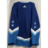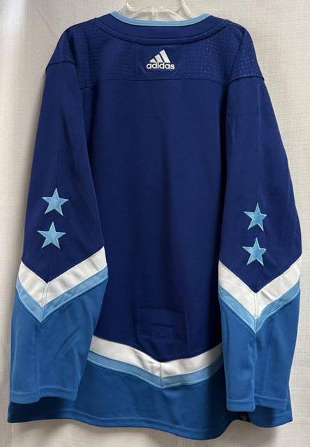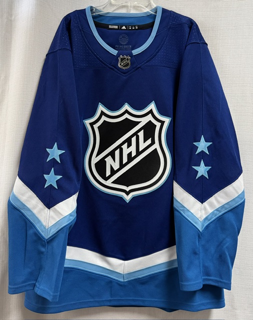 This is an adidas 2022 NHL All Star Primegreen blue men's Authentic jersey, size 50/Medium. This jersey has sewn on embroidered twill front and sleeve logos and has a tie down strap on the inside back. There is nothing wrong with this jersey, it just doesn't have hang tags (was a customer return).