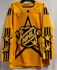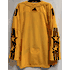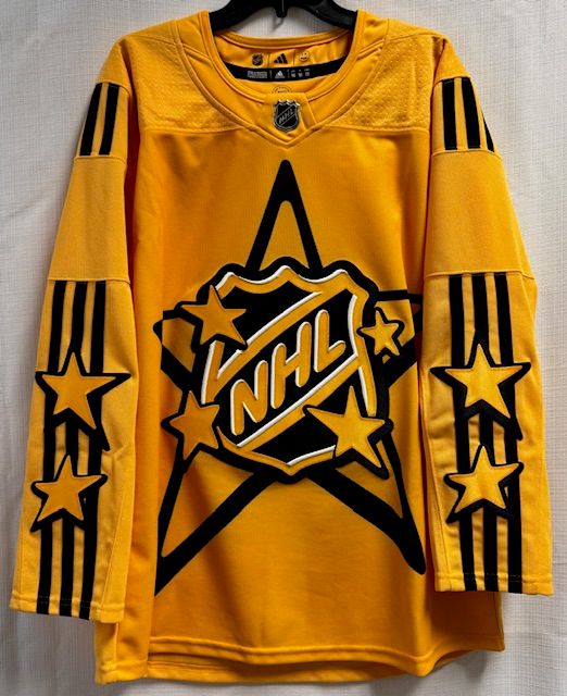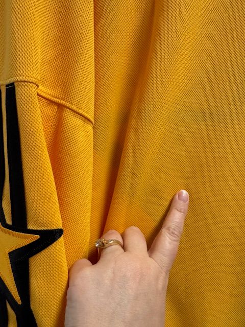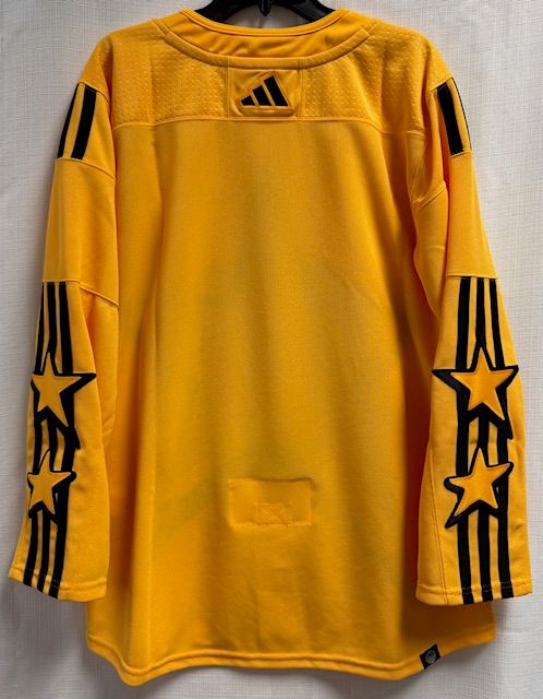 This is an adidas 2022 All Star Primegreen mens yellow jersey, size 50/Medium. This jersey has sewn on embroidered front and sleeve logos, a tie down strap on the inside back, and is made of recycled polyester. There is a small light spot on the mid-back of the jersey (see inset photo). Other than that, this jersey is in good condition and has tags.