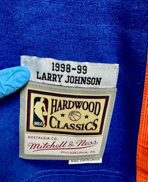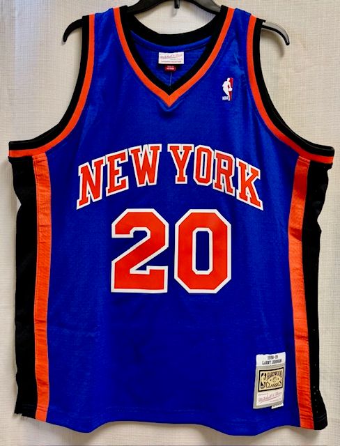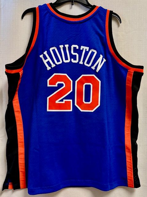 This is a Mitchell & Ness New York Knicks Houston #20 1998-99 mens Swingman jersey, size XL. This jersey has heat sealed printed twill front logo, player name, and numbers. The flaw with this jersey is that is has the wrong jock tag on the front (see inset photo). It is also missing the size hang tag (still has the other 'Hardwood Classics' hang tag). Other than that, this jersey is in good condition.