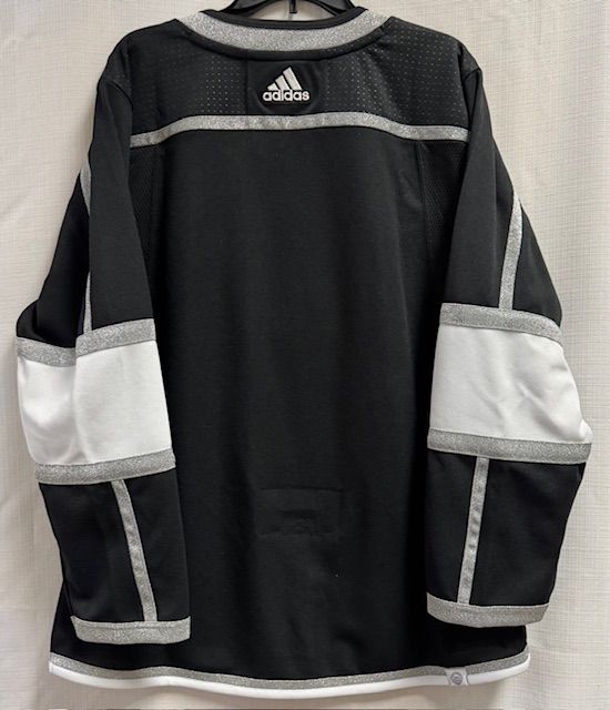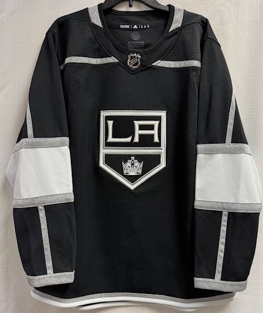 This is a Los Angeles Kings home mens Primegreen authentic jersey, size 50/Medium. This jersey has a sewn on embroidered front logo, a tie down strap on the inside back, and is made of recycled polyester. There is nothing wrong with this jersey, it just doesn't have any hang tags (was a customer return).