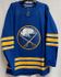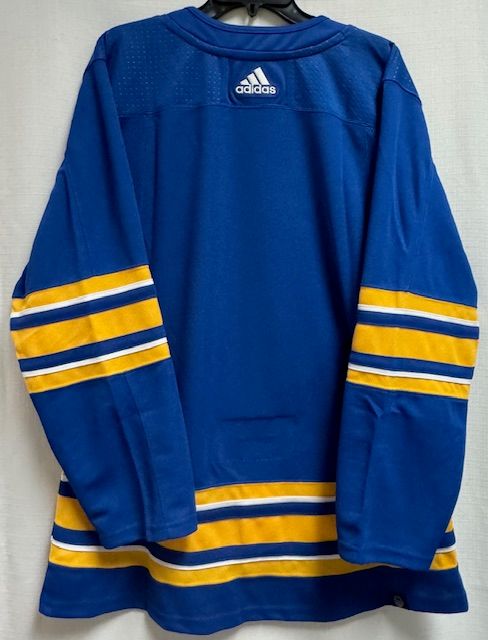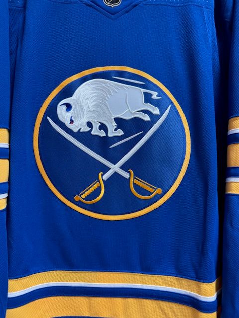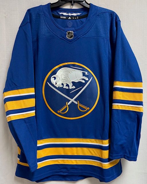 This is an adidas Buffalo Sabres home mens Primegreen authentic jersey, size 50/Medium. This jersey has a sewn on embroidered twill front logo and a tie down strap on the inside back. The flaw with this jersey is that the front logo is rotated slightly (see inset photo). Other than that, this jersey is in perfect condition and has hang tags.