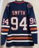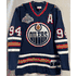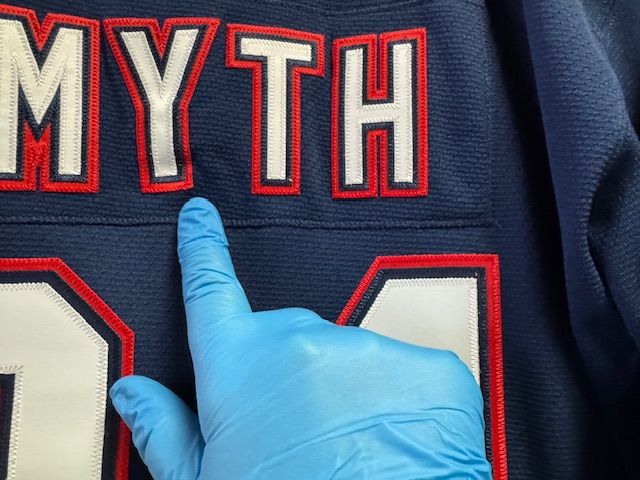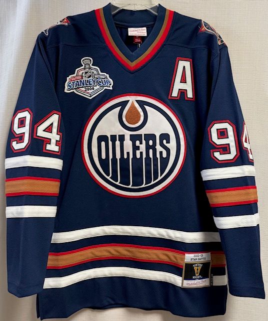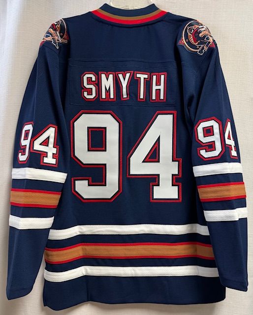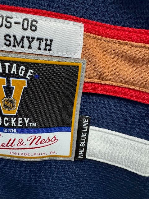 This is a Mitchell & Ness Edmonton Oilers Smyth 2005-06 mens jersey, size large. This jersey has sewn on embroidered twill front, shoulder, and chest logos, and back numbers. There are two flaws with this jersey, one is the Y in the player name is kind of crooked and wrinkled a bit, and two, the jersey is mis-marked as a Blue Line jersey (Blue Line jerseys have screen printed logos and everything on this jersey is sewn on). Other than that, this jersey is in great condition and has hang tags.