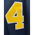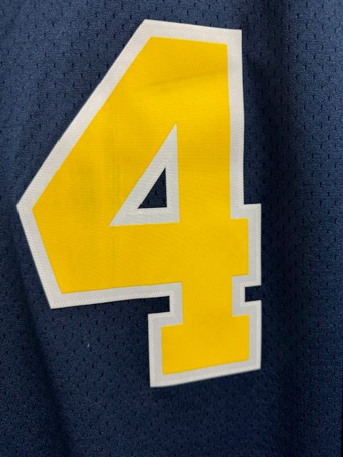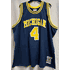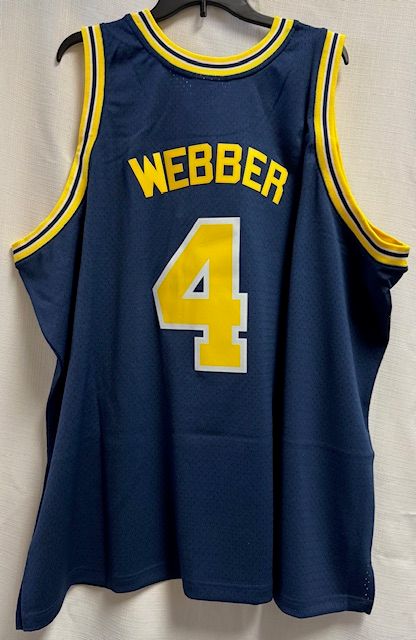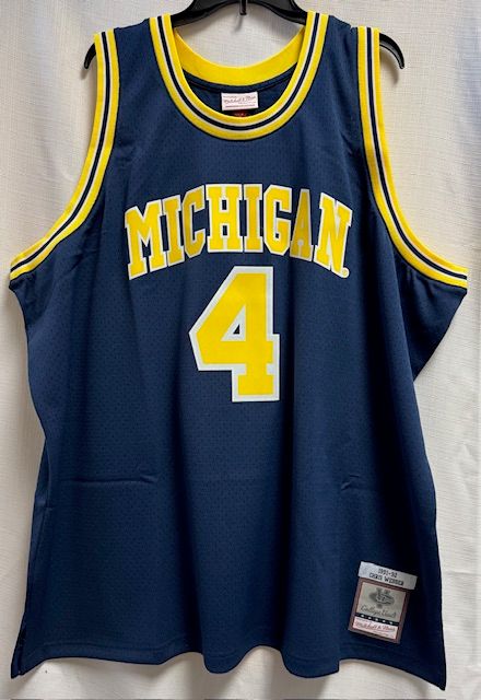 This is a Mitchell & Ness University of Michigan Webber #4 1991 mens Swingman jersey, size 4X. This jersey has heat sealed printed twill front logo, player name, and numbers. The flaw with this jersey is that there are blue marks on the back number (See inset photo--probably was in the heat press too long and it bled through). Other than that, this jersey is in good condition, brand new with tags.