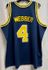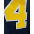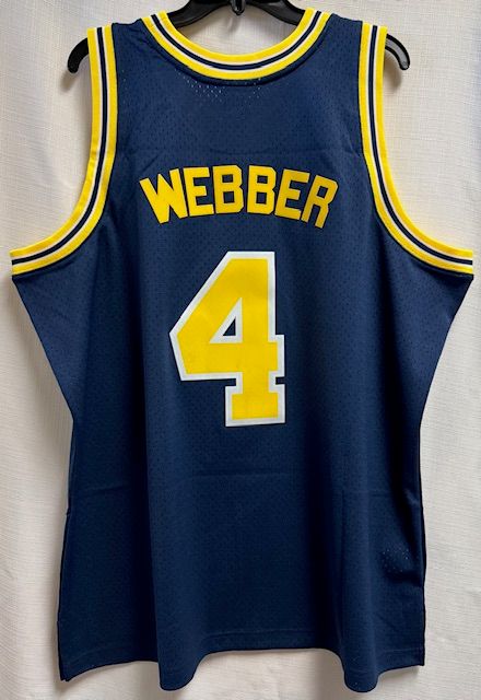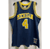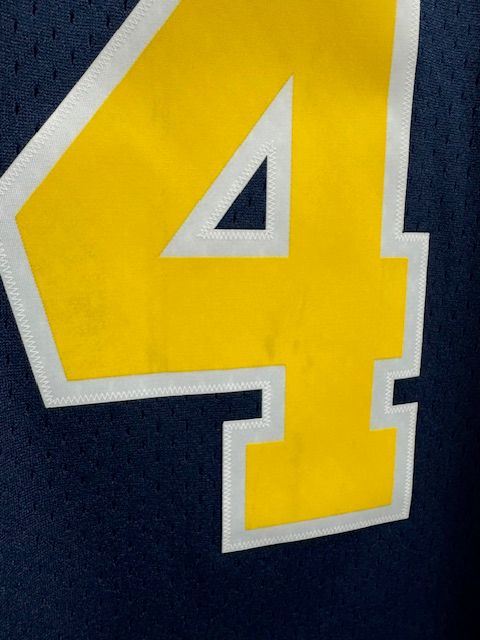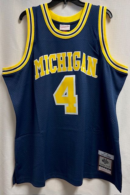 This is a Mitchell & Ness University of Michigan Webber #4 1991 mens Swingman jersey, size 2X. This jersey has heat sealed printed twill front logo, player name, and numbers. The flaw with this jersey is that there are several blue smudges on the back number (see inset photo--it was probably in the heat press too long and bled through). Other than that, this jersey is in good condition, brand new with tags.