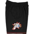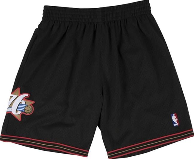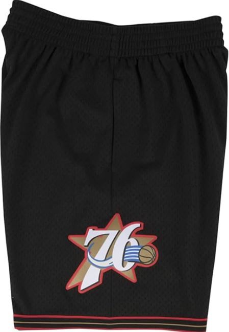 These are Philadelphia 76ers 2000-01 men's Swingman shorts. Made by Mitchell & Ness, these shorts are 100% polyester mesh with tricot lining and side seam pockets, have an elasticized waistband with drawstring and a heat sealed printed logo. Officially licensed.