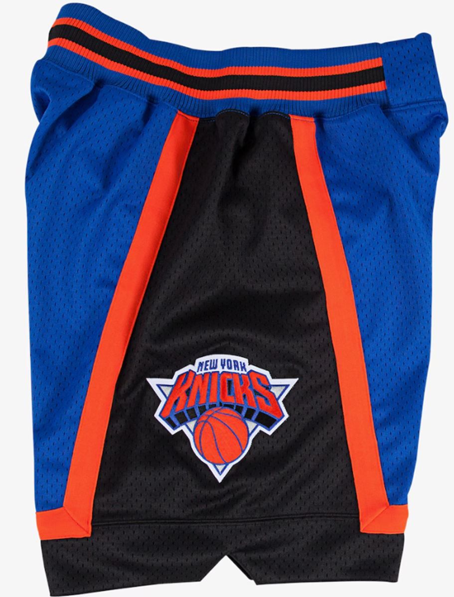These are New York Knicks 1996-97 mens road authentic shorts. Made by Mitchell & Ness, these shorts have a drawstring waist, two side pockets, sewn on embroidred team graphic on the right leg and waistband, 100% polyester mesh with tricot lining and side seam pockets. Fits true to size. Officially licensed.